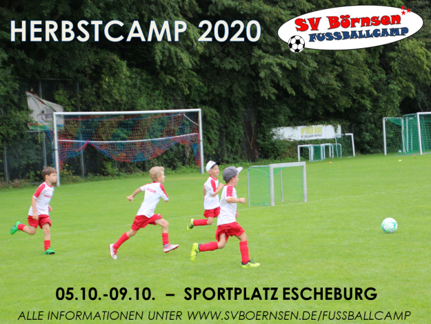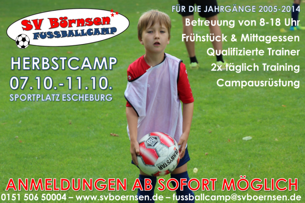 Für das diesjährige Fußballcamp im Herbst sind noch Plätze frei! Das Fußballcamp findet vom 05.-09. Oktober auf dem Sportplatz in Escheburg statt. Die Teilnehmer erwarten fünf Tage voller Fußball, Spaß und Gemeinschaft. In täglich zwei Trainingseinheiten lernen und verbessern die Teilnehmer ihre Technik und wenden die gelernten Inhalte anschließend in Spielen und Spielformen an. Anmeldungen…